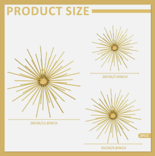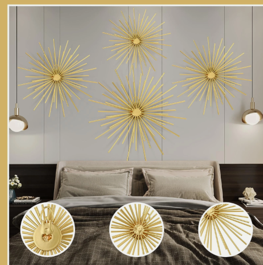 In conclusion, this 4-piece gold metal starburst wall decor set combines durability, style, and versatility. The 3D spike design with bling finish adds visual interest and sophistication to any wall. For those looking to elevate their home or office décor with modern, statement-making art, this starburst set is the perfect addition.