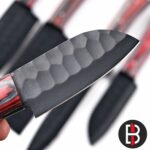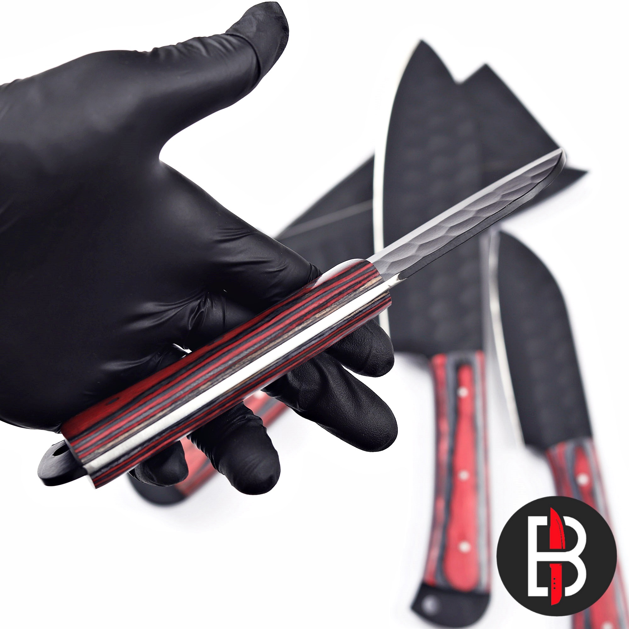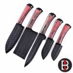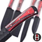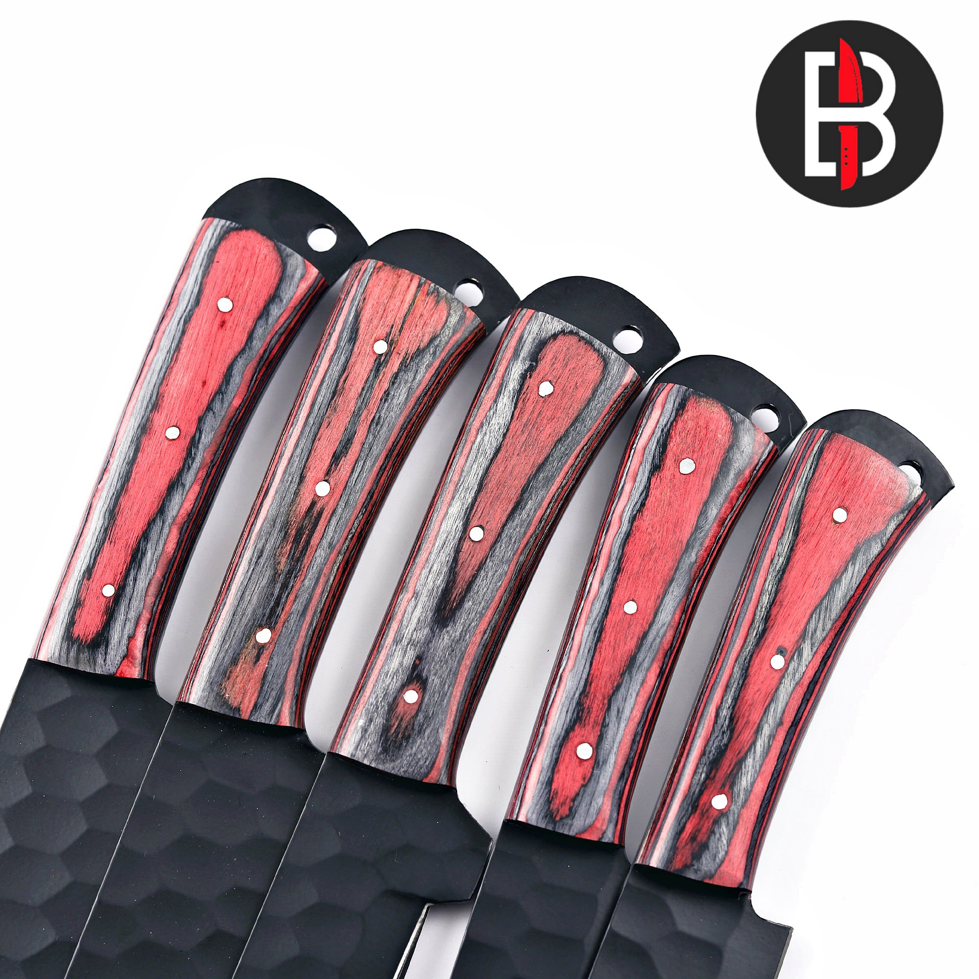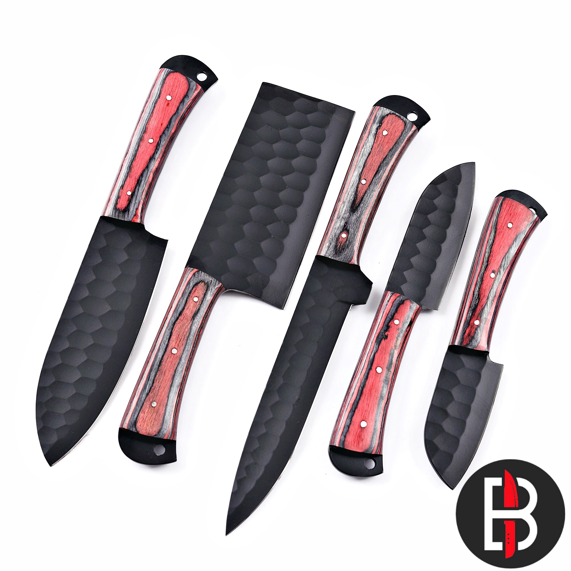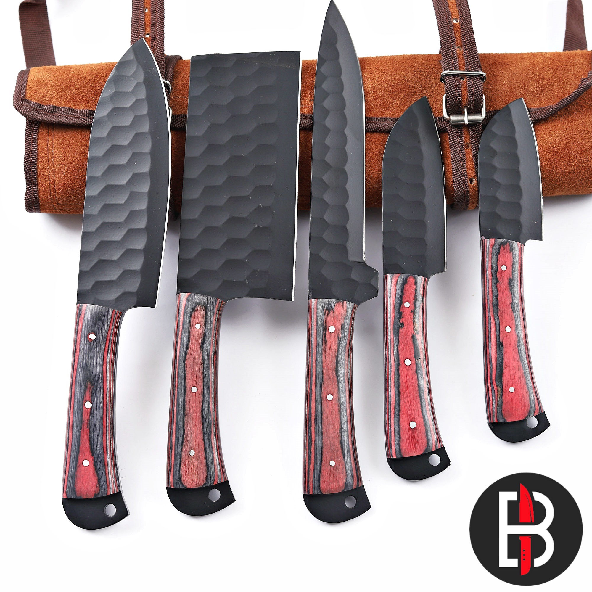 Upgrade your kitchen or retail selection with this handcrafted 5-piece carbon steel knife set, designed for chefs and cooking enthusiasts alike. Each knife features a durable carbon steel blade for exceptional sharpness and edge retention, paired with a red wooden handle that offers both comfort and elegance.