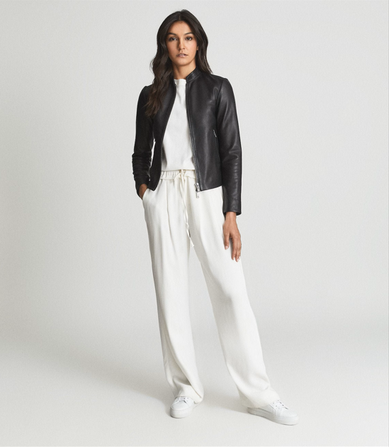 Our jacket features a classic racer style silhouette that enhances your feminine shape. The streamlined cut fits perfectly around the shoulders and waist, creating a flattering look. Minimalist seams and subtle stitching add elegance while keeping the focus on clean lines. Transition seamlessly from day to evening with a piece that pairs effortlessly with jeans, skirts, or dresses.