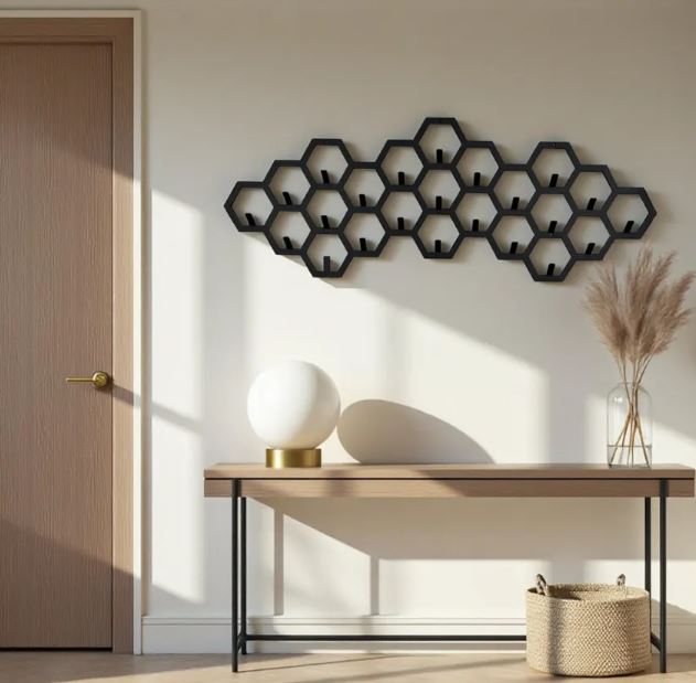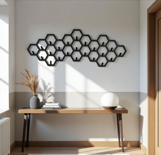 The honeycomb design draws inspiration from natural beehive structures. The repeating hexagonal pattern adds texture and rhythm to your wall. Therefore, it complements modern, industrial, and minimalist interiors. It also doubles as decorative art, not just a functional hook.