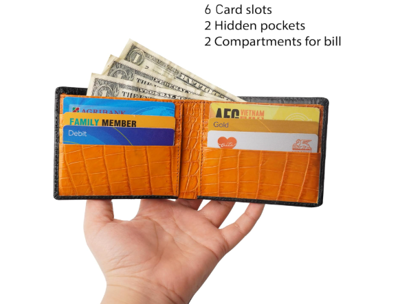 Upgrade your everyday essentials with this Black & Orange Alligator Belly Leather Bifold Wallet. It offers luxury, security, and exceptional style in one elegant accessory.