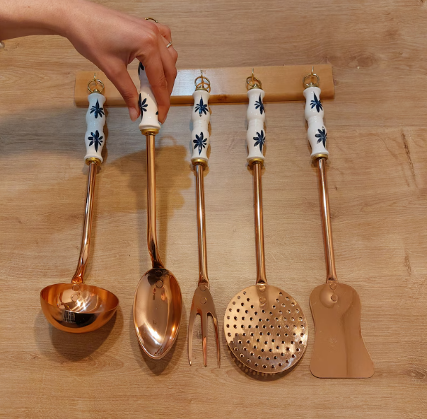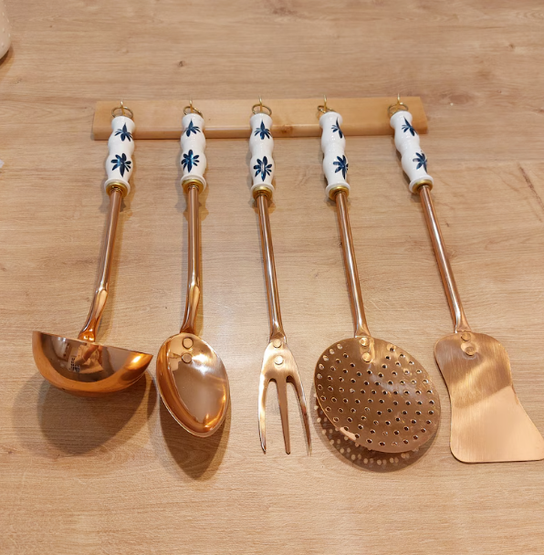 Bring a touch of tradition and artistry to your home with this Copper Kitchen Utensil Set of 5 with Porcelain Handles and Holder — where craftsmanship meets timeless style, and every meal feels special.