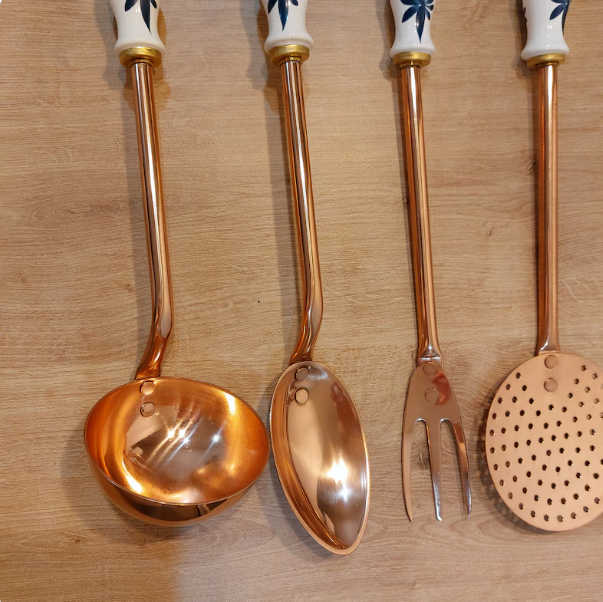 Each piece in this copper utensil set is handcrafted with care and precision. Skilled artisans shape and polish every detail, ensuring a smooth finish and refined texture. The blend of solid copper and porcelain handles creates a stunning contrast between rustic warmth and modern sophistication. Every utensil is unique, showcasing natural variations in color and shine that add to its charm.