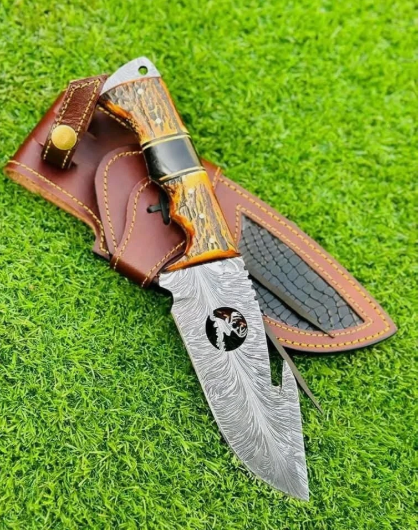CUSTOM HANDMADE DAMASCUS HUNTING KNIFE WITH REAL STAG ANTLER HANDLE FULL TANG HD