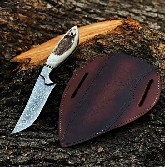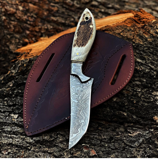 Custom Handmade Hunting skiner Damascus Steel Blade Stag Handle & Leather Sheath