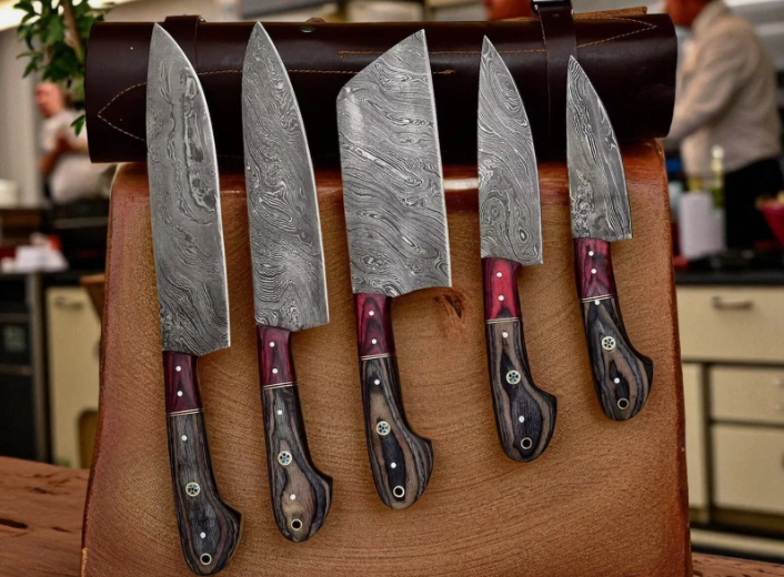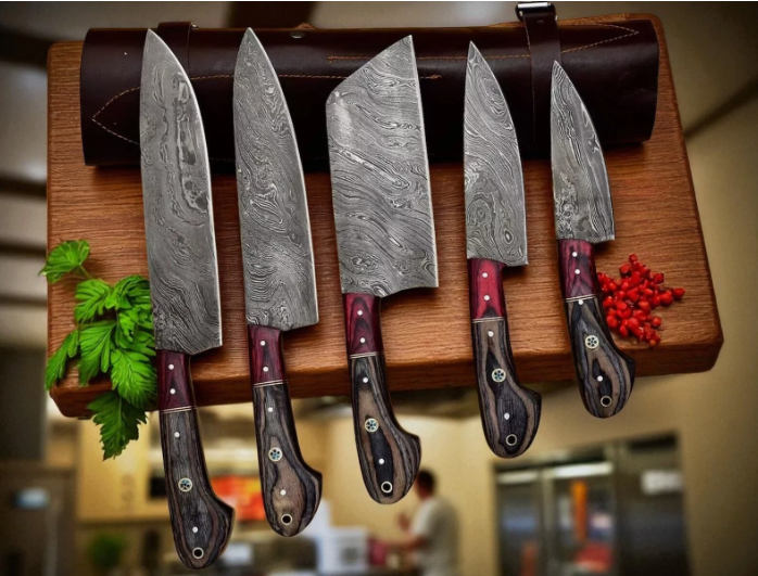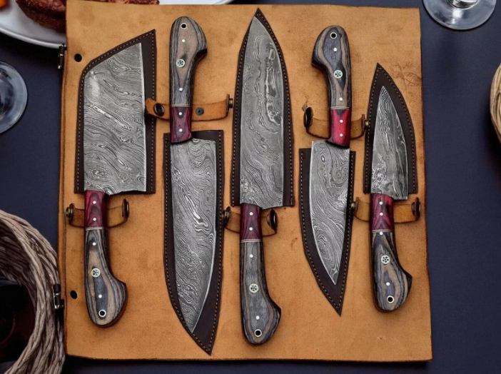 Damascus Chef Knife Set 5PC Handmade Kitchen Knives with Leather Sheath – Gift