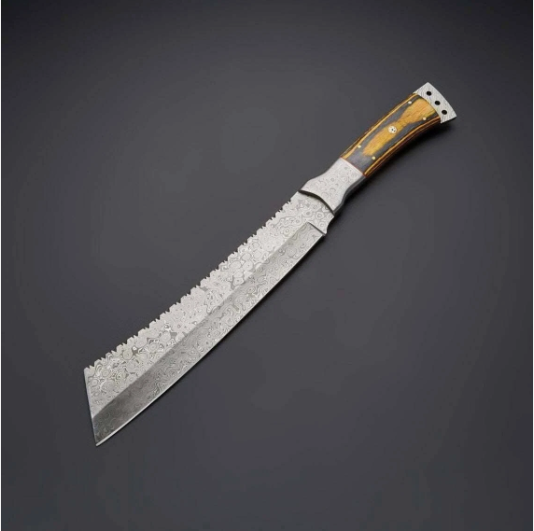 Hand Forged Damascus Steel Machete Knife With Leather Sheath.