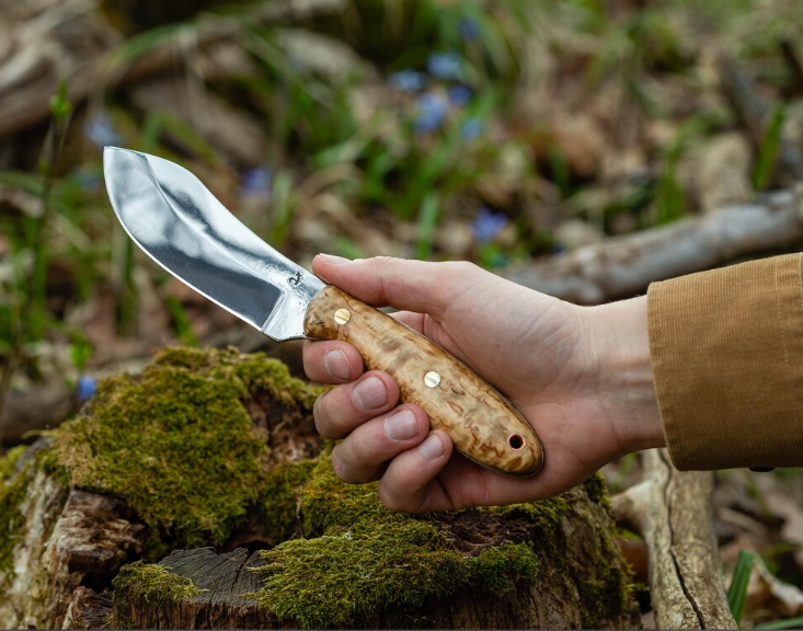 Moving to the handle, the curly birch wood brings both comfort and beauty. Its natural texture provides a firm, non-slip grip, while the warm tone of the wood adds elegance to the rugged design. Over time, the birch darkens slightly, giving your knife a personalized, weathered charm. As a result, no two knives ever look exactly the same—each one is truly unique.