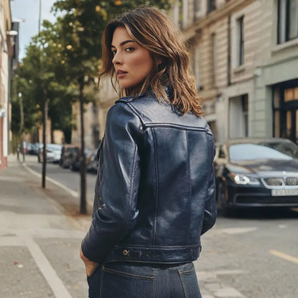 This handmade navy blue leather jacket for women is crafted from 100% genuine sheepskin. Soft, supple, and durable, the leather feels luxurious against the skin. Unlike synthetic alternatives, it naturally adapts to your body shape over time. As a result, the jacket becomes more comfortable with every wear. The rich navy color adds a fresh twist to classic denim-style outerwear, making it a versatile wardrobe staple.