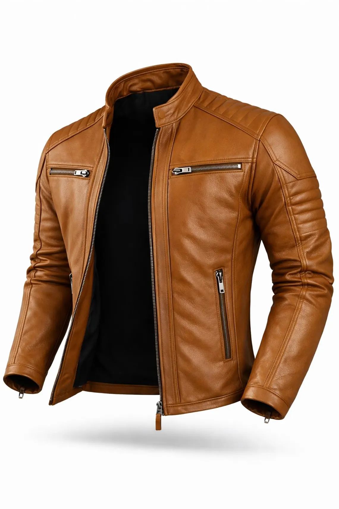 Made from premium tan leather, this jacket offers long-lasting strength and comfort. The soft texture feels smooth against the skin while maintaining resilience for everyday wear. Over time, the leather develops a natural patina that enhances its character. As a result, the jacket looks better with age. Its durability makes it perfect for motorcycle rides, casual outings, or urban adventures.