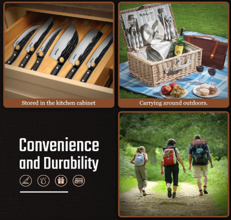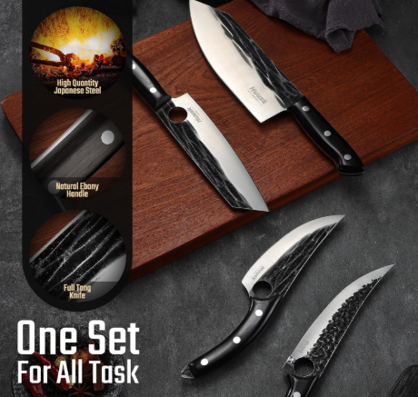 The Huusk Knives Set – Serbian Chef Knife Set with Bag is built for serious cooking. First of all, it combines Japanese sharpness with Serbian strength. As a result, every cut feels effortless. More importantly, each knife is hand forged from high carbon steel for long-lasting performance.