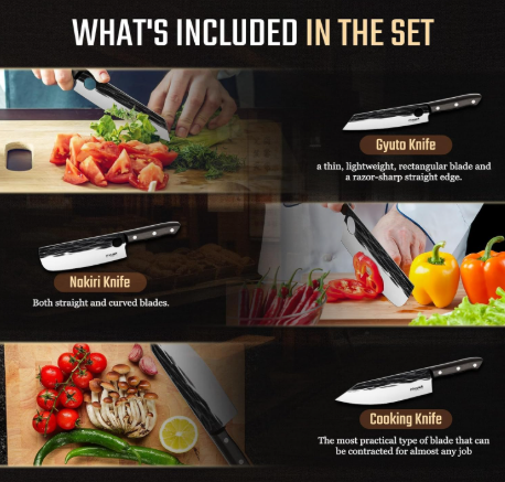 This Japanese kitchen knives set delivers razor-sharp performance for both home and professional kitchens. Whether you chop vegetables, slice meat, or fillet fish, every motion is smooth. As a result, prep time is faster. In turn, your cooking becomes more precise.