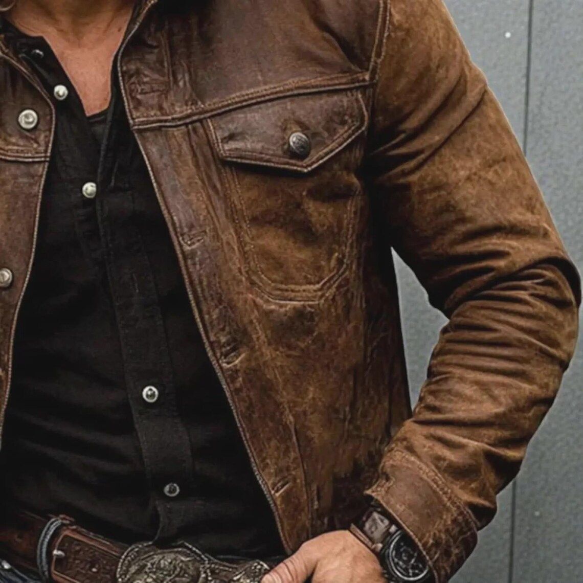 High-quality genuine leather gives this jacket its rugged strength. The distressed surface creates a worn-in look without compromising durability. Over time, the leather develops a rich patina. Because of this, the jacket only gets better with age. In addition, the brown tone complements both casual and Western-inspired outfits.