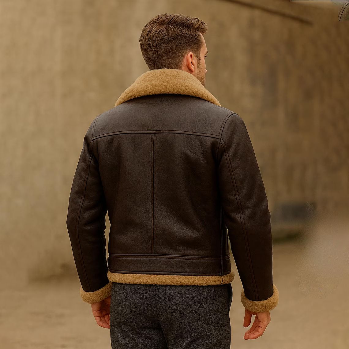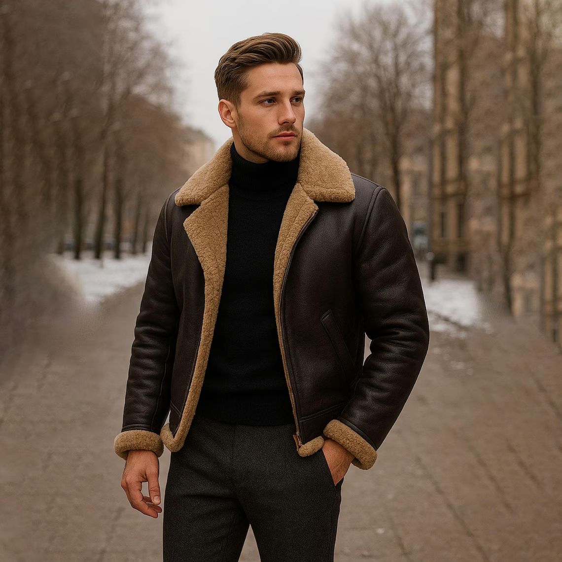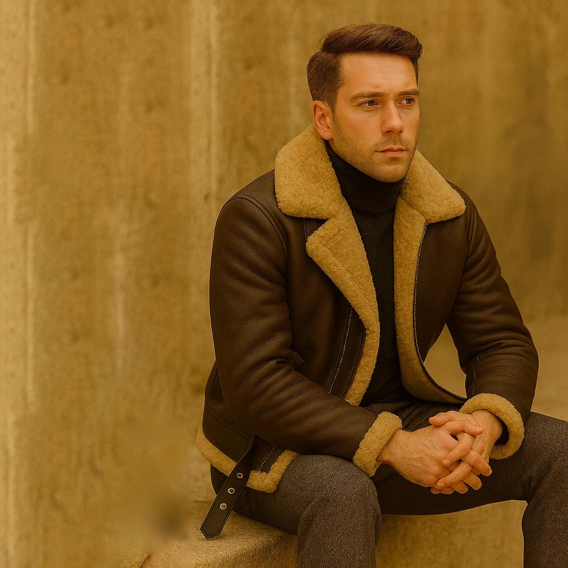 This men’s shearling leather jacket offers premium warmth, timeless aviator style, and rugged durability. It is the ultimate winter outerwear for style-conscious men.