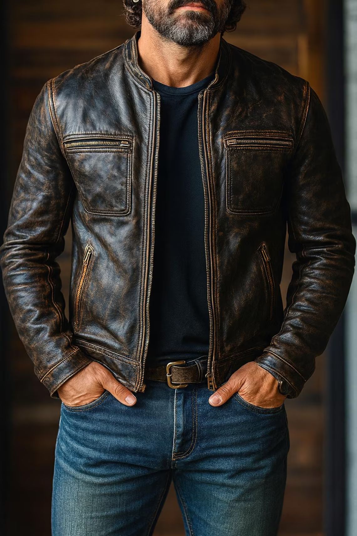 Each jacket features a carefully applied distressed finish. As a result, you get a rugged, broken-in appearance from day one. Skilled artisans handcraft every detail, ensuring no two pieces look exactly alike. The vintage black tone adds depth and texture, while subtle shading highlights the biker-inspired design. Therefore, you enjoy a timeless outerwear piece that never goes out of style.