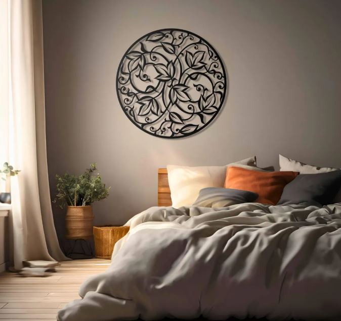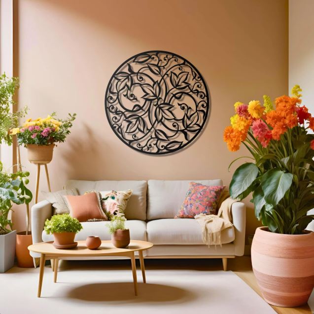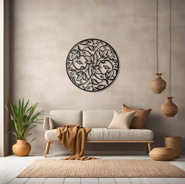 This wall art draws inspiration from traditional mandala patterns. However, the clean metal lines give it a contemporary feel. The repeating leaf shapes feel rhythmic and intentional. Therefore, it works beautifully in modern, bohemian, and minimalist interiors. It adds detail without overwhelming the space.