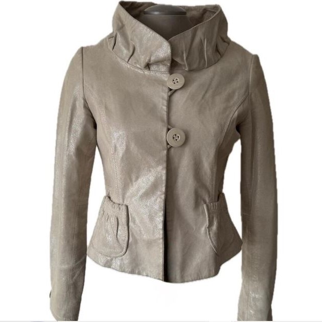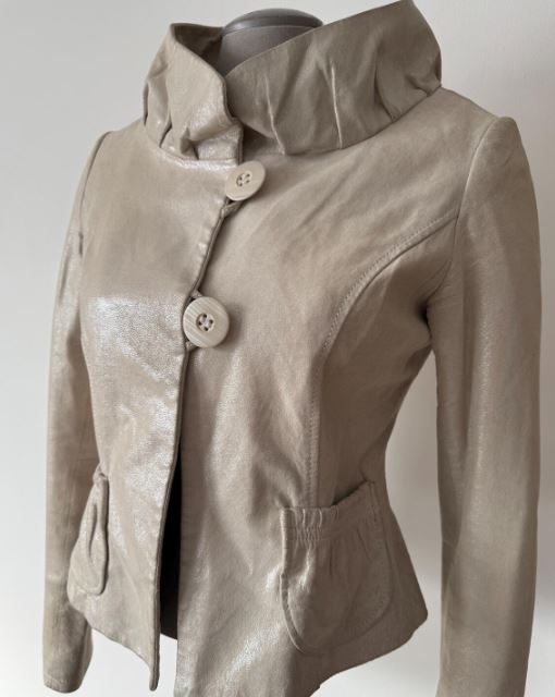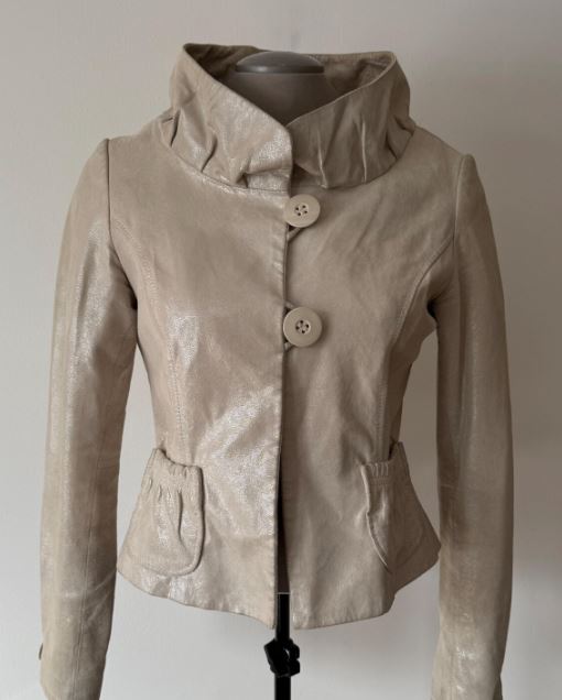 This jacket combines authentic leather with a subtle metallic or shimmery surface. The finish gives it a fashion-forward look while keeping the texture smooth and supple. The leather naturally develops character with age, creating a rich patina that enhances its vintage vibe. As a result, the jacket feels both nostalgic and stylish.