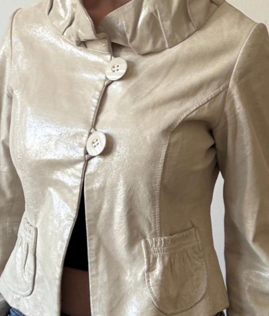 The Vintage 2000’s Shimmery Leather Danier Jacket captures the bold fashion spirit of the early 2000s (Y2K). It features a striking shimmery finish that reflects light and adds a touch of glam to every outfit. Because of this unique sheen, it stands out from ordinary leather jackets while keeping classic structure and edge.