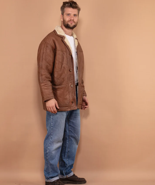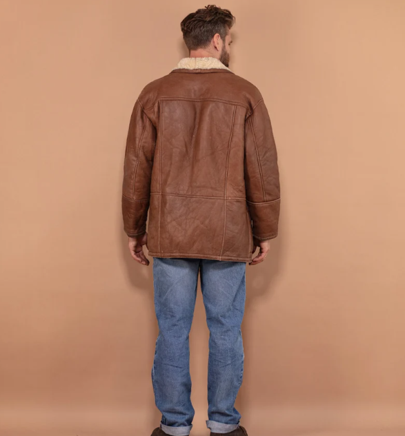 This Vintage 80s Brown Sheepskin Shearling Coat delivers classic retro style with modern comfort. It elevates your look while keeping you warm and protected. Its vintage design, functional features, and premium material make it an essential piece for men who appreciate authentic 80s fashion.